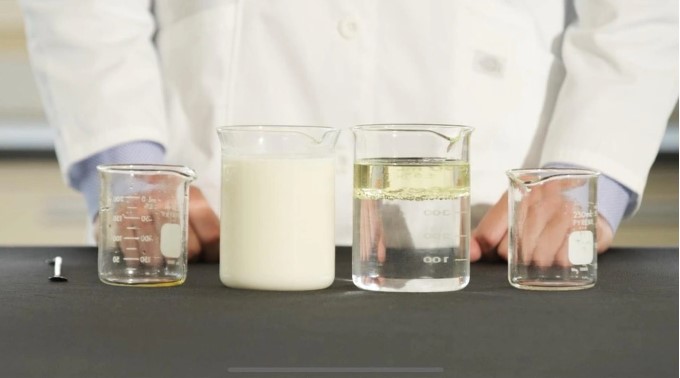 Thí nghiệm cho thấy dầu cá có chứa công nghệ Aquacelle dễ dàng được nhũ hóa trong nước (trái), dầu cá không chứa công nghệ Aquacelle không tan trong nước (phải), tạo thành lớp dầu mỏng ở phía trên mặt nước