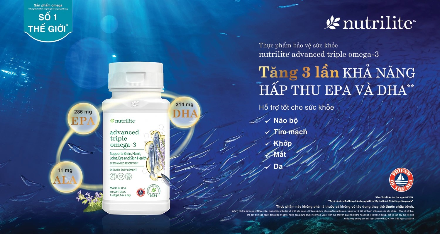 Thực phẩm bảo vệ sức khỏe NutriliteTM Advanced Triple Omega-3 cung cấp hàm lượng cao các Omega-3 thiết yếu như EPA, DHA từ cá biển, và ALA từ hạt chia trắng. NutriliteTM Advanced Triple Omega-3 ứng dụng công nghệ Aquacelle® hỗ trợ hấp thu EPA và DHA tốt hơn gấp 3 lần. Sử dụng 1-2 viên mỗi ngày để hỗ trợ tốt cho sức khỏe não bộ, tim mạch, khớp, mắt, và da.