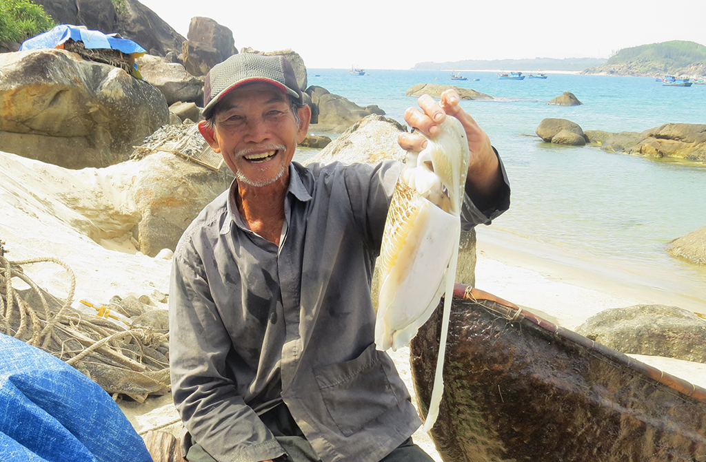 Lão ngư Đinh Sanh (ở Sa Huỳnh, Quảng Ngãi) với con mực tươi vừa vớt lên từ biển