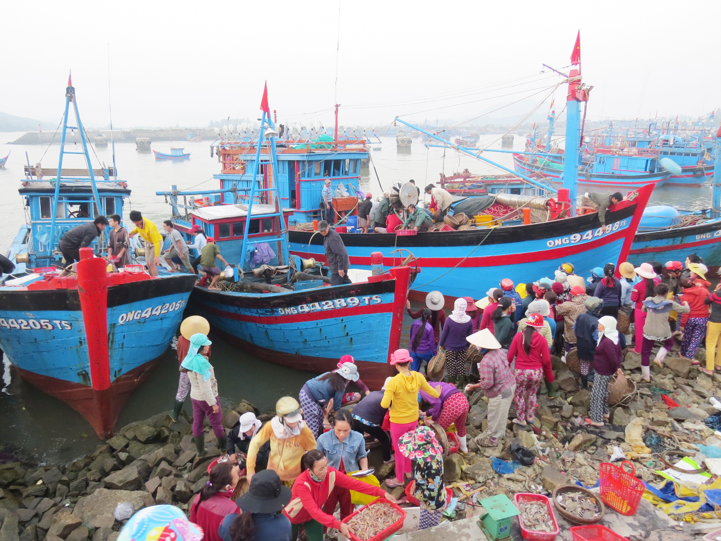 Tàu cá cập bờ, trên bến dưới thuyền rộn tiếng nói cười, ngã giá bán mua