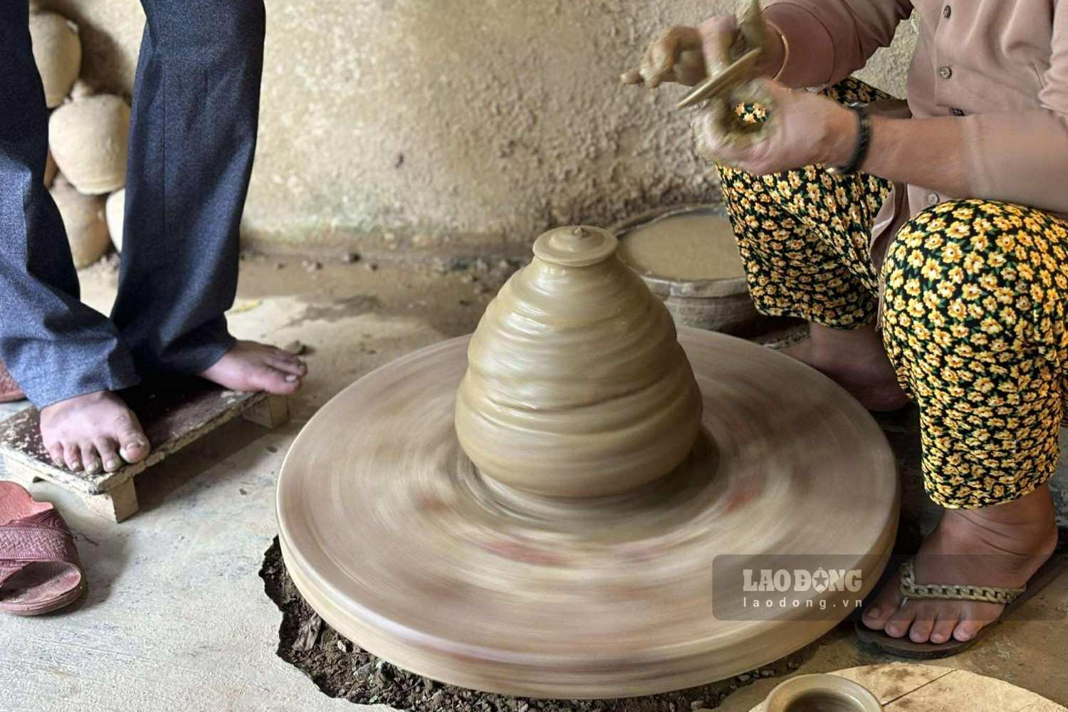 Đến với làng nghề, du khách sẽ được chiêm ngưỡng nghệ nhân chuốt gốm trên bàn xoay chân - công đoạn đòi hỏi sự khéo léo, nhịp nhàng giữa đôi tay và cảm nhận tinh tế với đất.